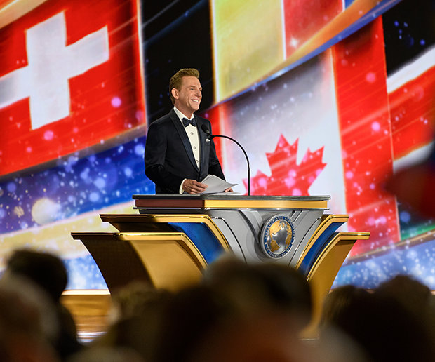 Capping an inspiring presentation on the humanitarian campaigns, Mr. Miscavige reveals new broadcast programming on Scientology Network—igniting a sea of waving flags and cheers across the Grand Marquee.
